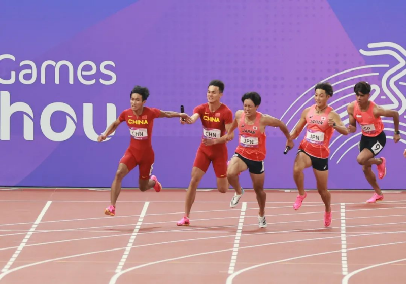 这场男子4×100米接力大战,中国前三棒交接平稳,第四棒陈佳鹏接棒时,中国队稍微落后,陈佳鹏发挥强大的后程加速能力,在最后30米逆袭日本选手率先撞线,助中国队夺冠。