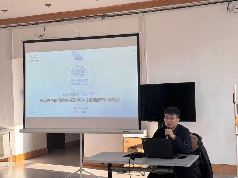 本次知识讲座特邀吉林省体育科学研究所(吉林省反兴奋剂中心)反兴奋剂办公室科员、研究实习员、省级纯洁体育教育讲师李政来我中心进行授课,授课内容为:三品兴奋剂风险防控及2024《禁用清单》新变化。授课结束后设置了互动问答环节,结合授课内容还对参训全员进行了反兴奋剂知识考试。省反兴奋剂中心为省射击射箭运动管理中心运动员发放了反兴奋剂知识手册,最后全体人员进行了庄严宣誓。