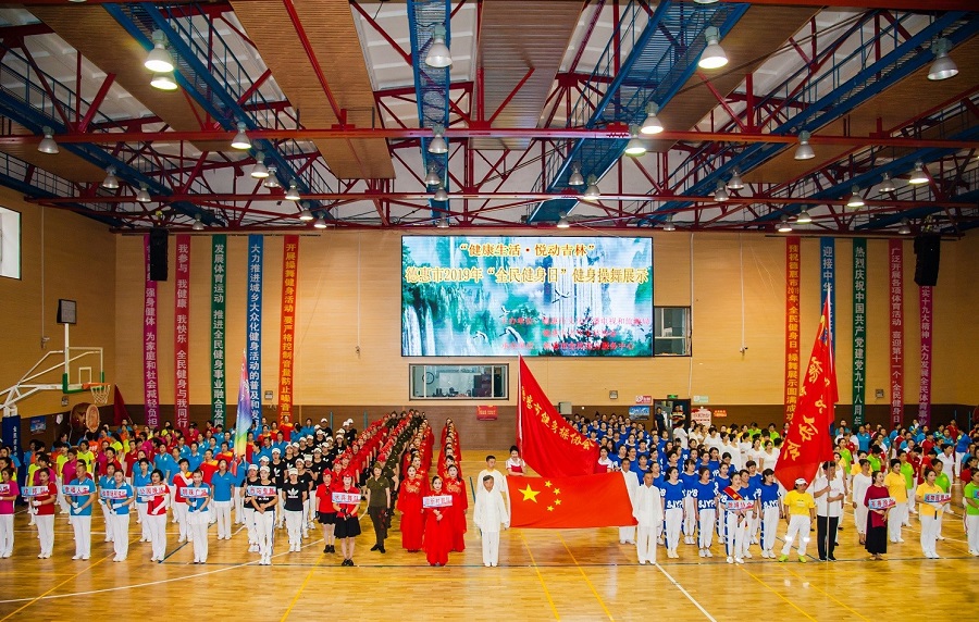 8月3日,为庆祝第11个“全民健身日”,迎接新中国建国70周年,德惠市文化广播电视和旅游局(体育局)、德惠市老年体育协会联合举办“健康生活·悦动吉林”2019年“全民健身日”健身操舞展示大会。23支代表队400多人参加了第九套广播体操、广场舞、有氧健身操、绳操、音乐跳绳、水兵舞、曳步舞、瑜伽、威风锣鼓等九个项目的集体展示活动。