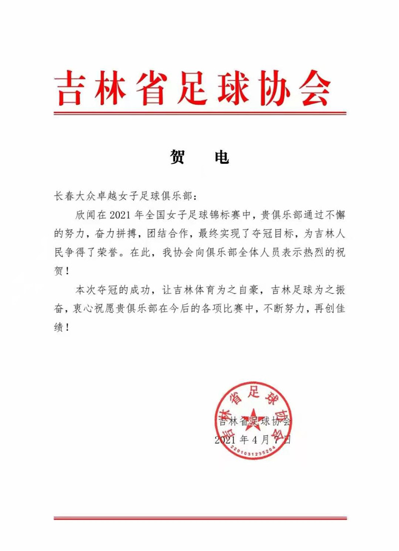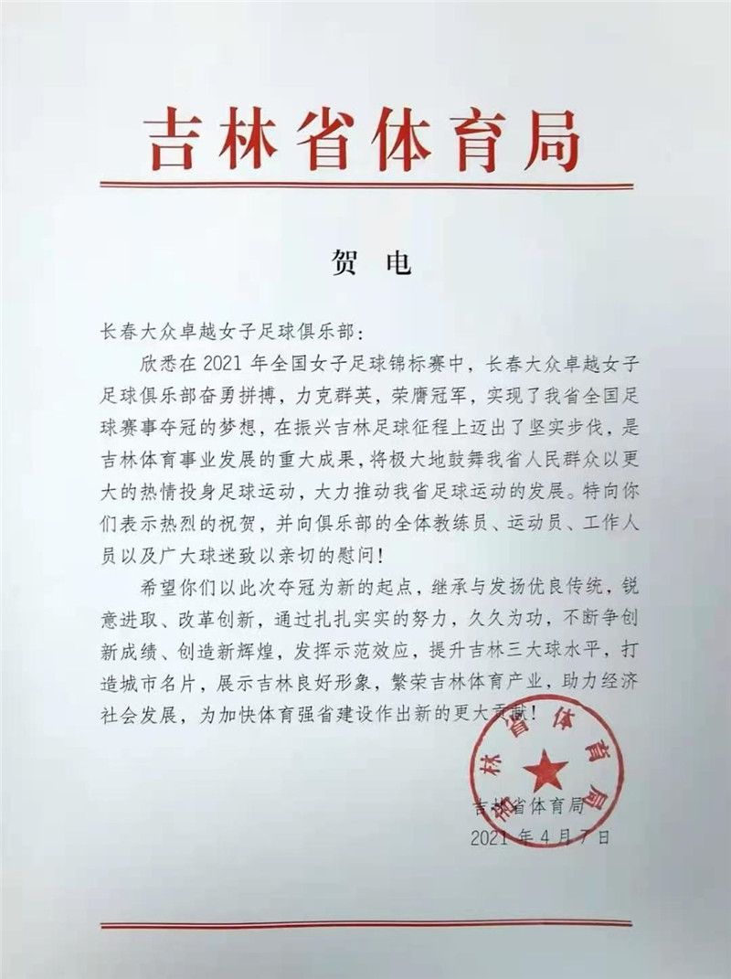 昨天,吉林省体育局和吉林省足协发来贺电,祝贺长春女足勇夺全国冠军。